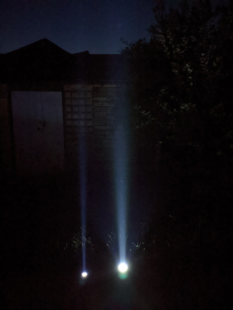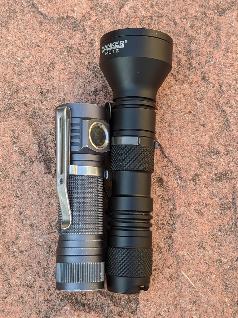 The only other thrower I own in the MC12’s league is an Astrolux FT03. I have the XHP50.2 version, which is 4300lm and throws 735m. Being 6 times as bright but only having 13% more throw means the FT03 has a much wider beam than the MC12. This is due to the much larger LED size. The Manker is clearly smaller and weighs under a third of the Astrolux, so it’s impressive that it throws almost as far.