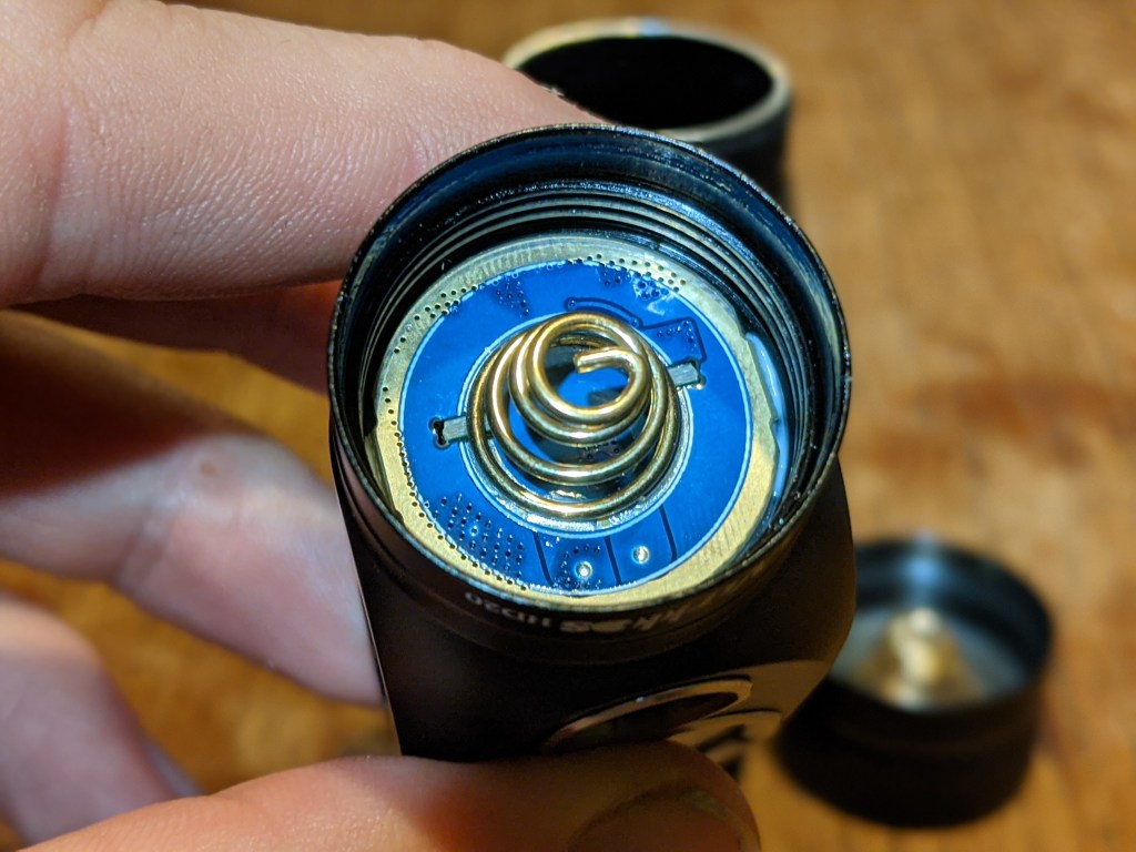 The HD20 has medium springs at each end, which allows it to take a 18650 cell or the supplied 21700 cell. Anodising seems good – I’ve removed the clip a few times now and there’s no marks. There’s no sharp edges, aside from the lanyard hole, which could do with a chamfer.