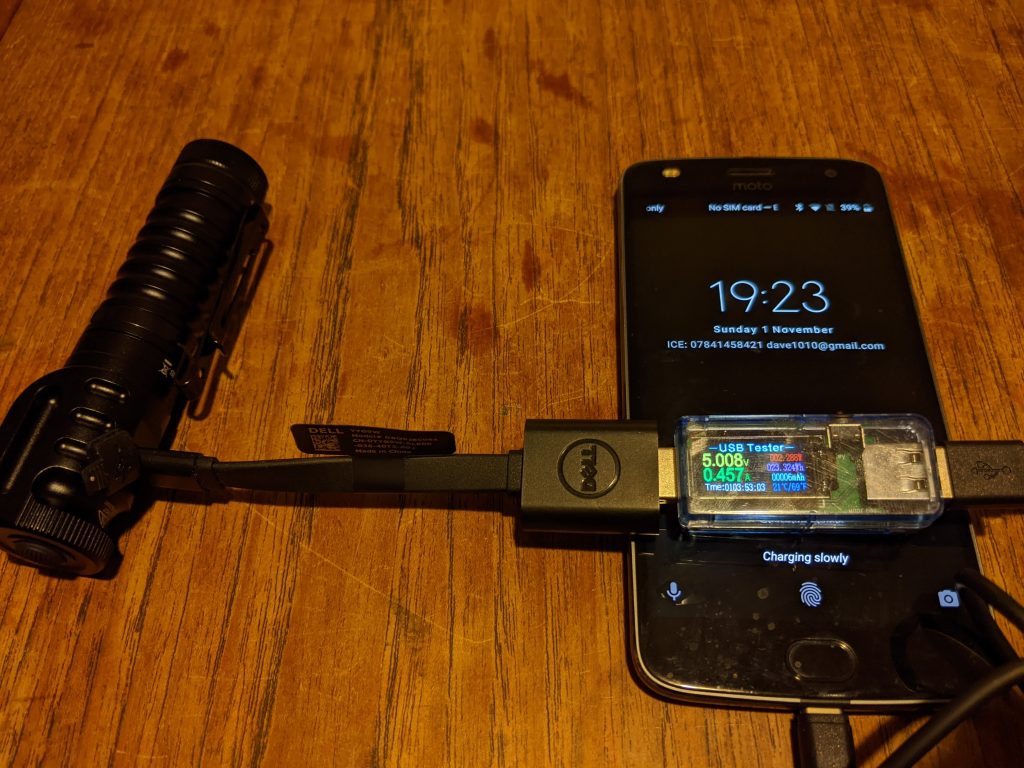 The HD20 has an power bank functionality too, which not many flashlights have. The manual says the HD20 can supply up to 1.6A. I’ve had mixed results with this but that could be down to my cables. I’ve got it to charge 2 phones at 0.5A, going C-A-C. I haven’t got a plain C-C cable to work yet.