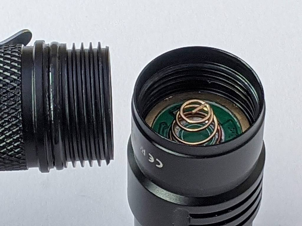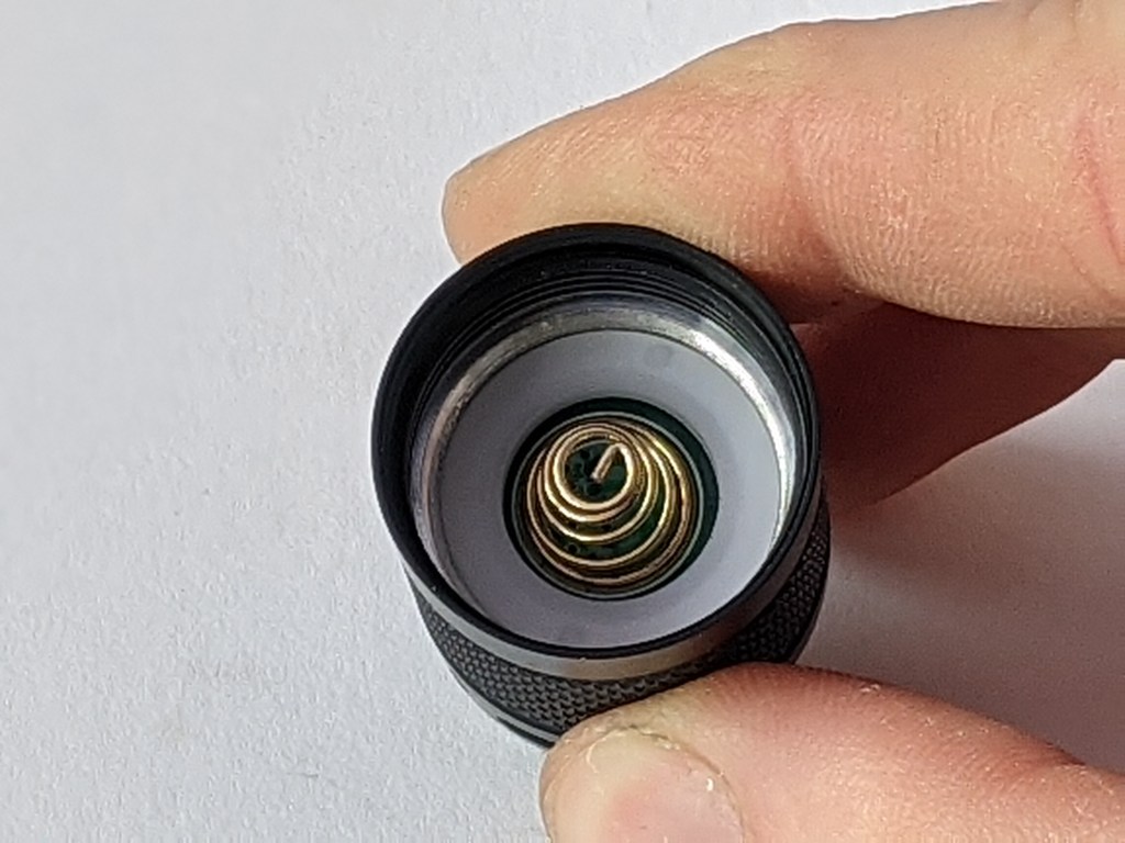 Both flat top and button top cells seemed to work fine in the light. There’s a spring at each end which means almost any 18650 cell should fit.