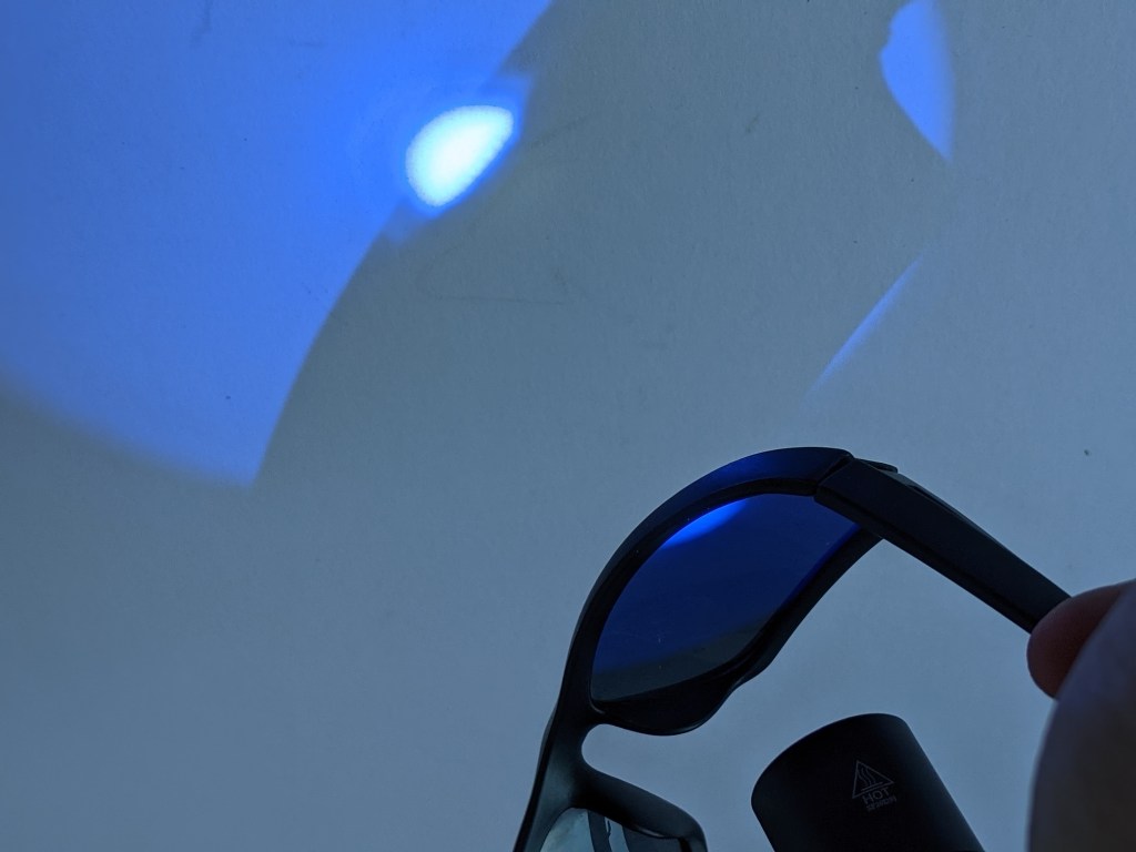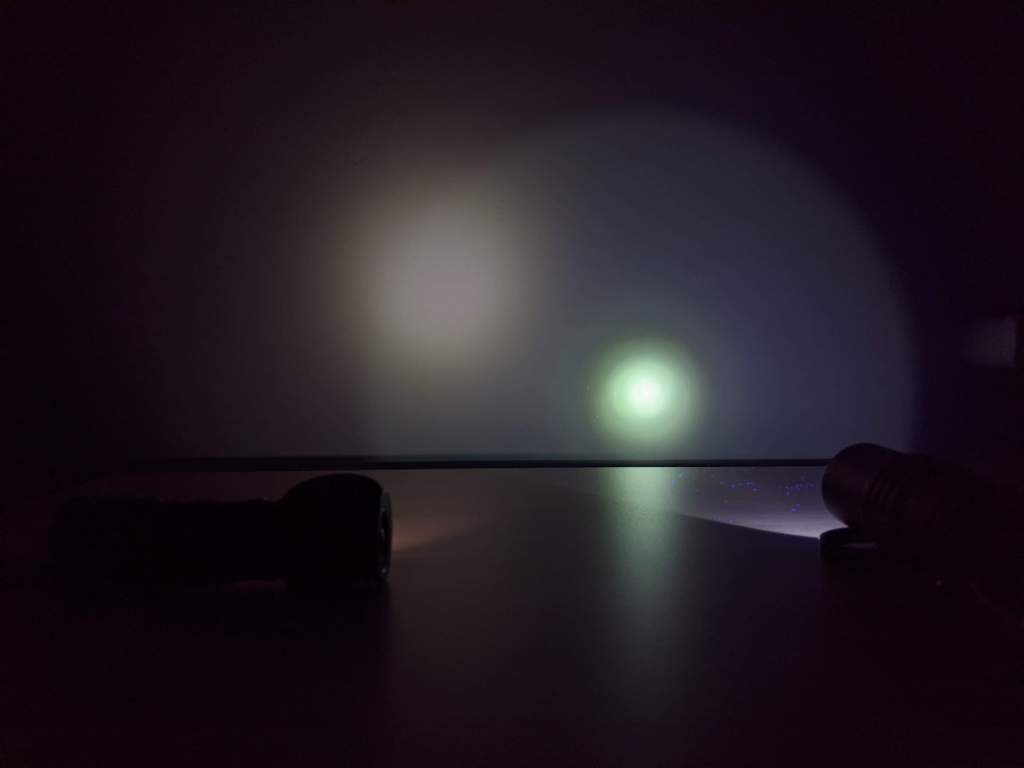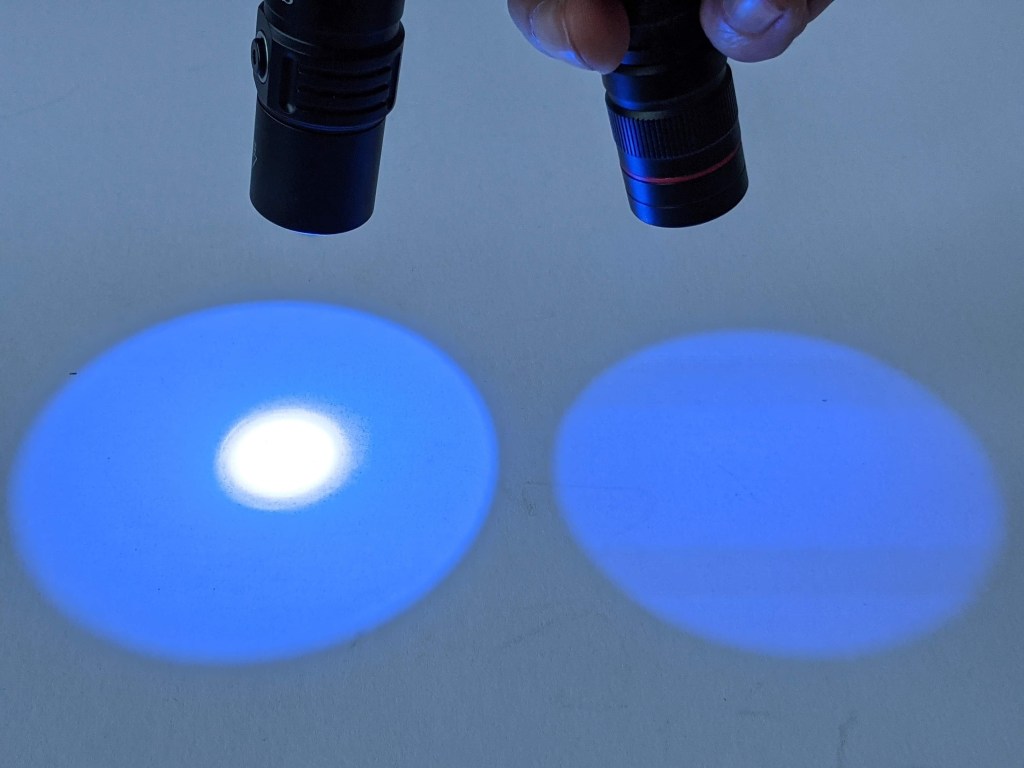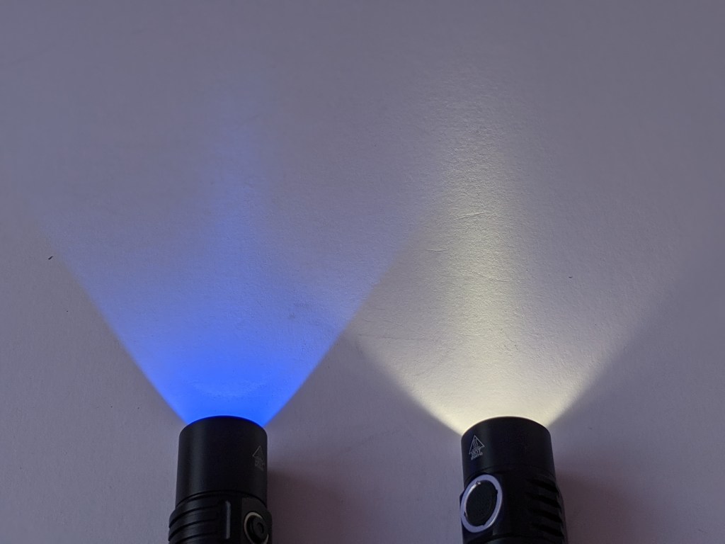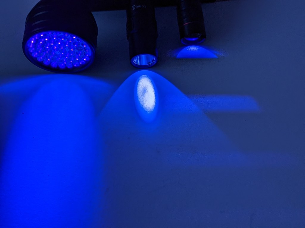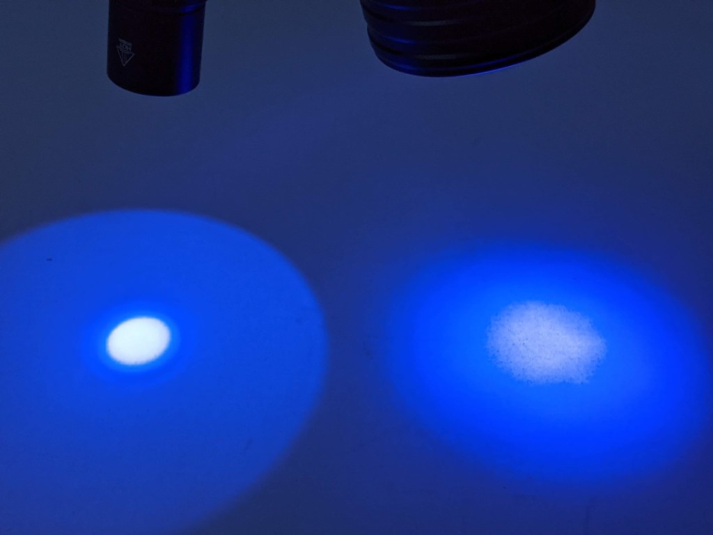 I don’t have a way to measure UV light, so there’s no lux readings or run times here. You also can’t see UV, so photos of the beam itself aren’t that useful. UV makes some things fluoresce though, so here’s the SP31UV shining on a white board.