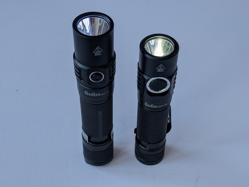 Here’s the SP31UV next to the slightly shorter SC31 Pro. The SP31 UV is a fairly standard flashlight, taking 18650 cells and with a 22.4mm width.