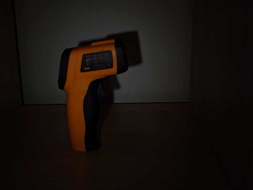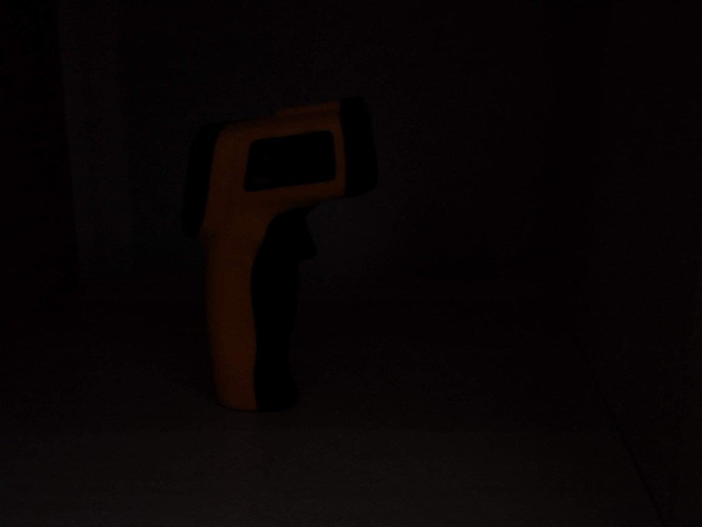 Here’s my bright orange digital thermometer in the dark, lit with a white flashlight and lit with the SP31UV. As there’s no white material, there’s barely any violet light, like you get from cheap UV lights.