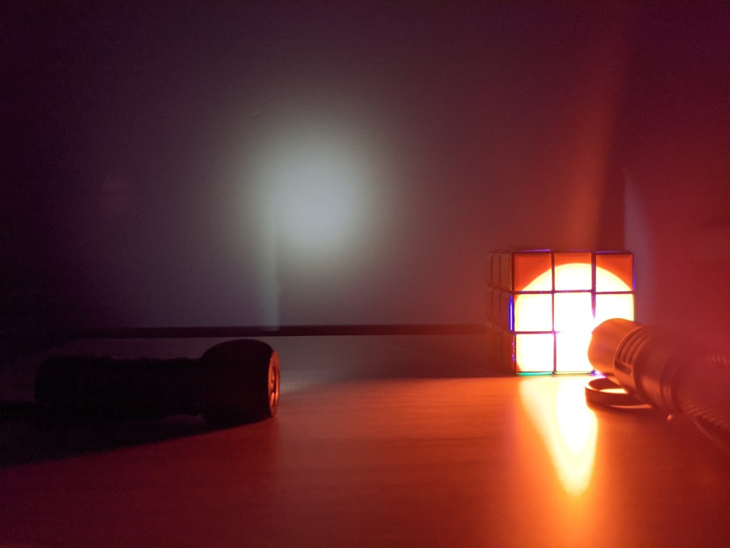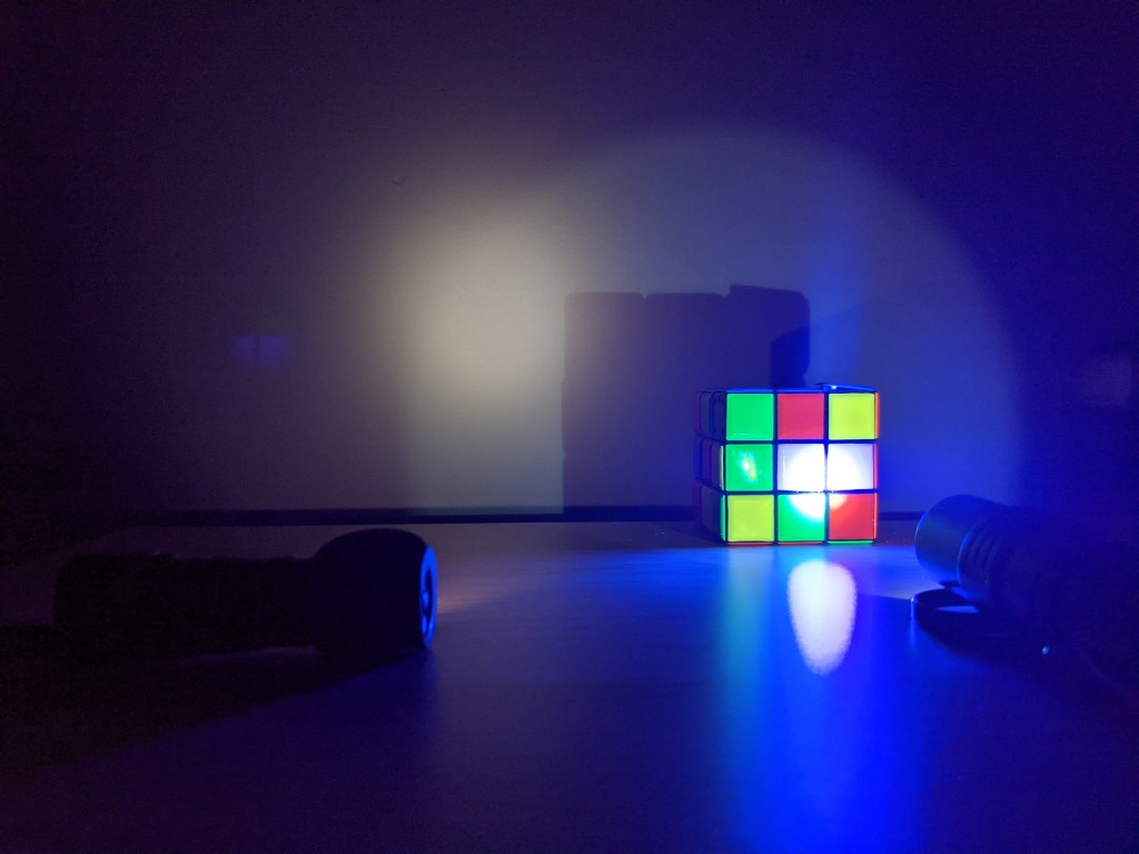 Against an off-white wall, the SP31UV looks white to the eye. Here it is compared to a Zebralight H53w on 12 lumen mode. These are all on fixed exposure, with the lights both constantly on, moving a Rubiks cube in front of either light.