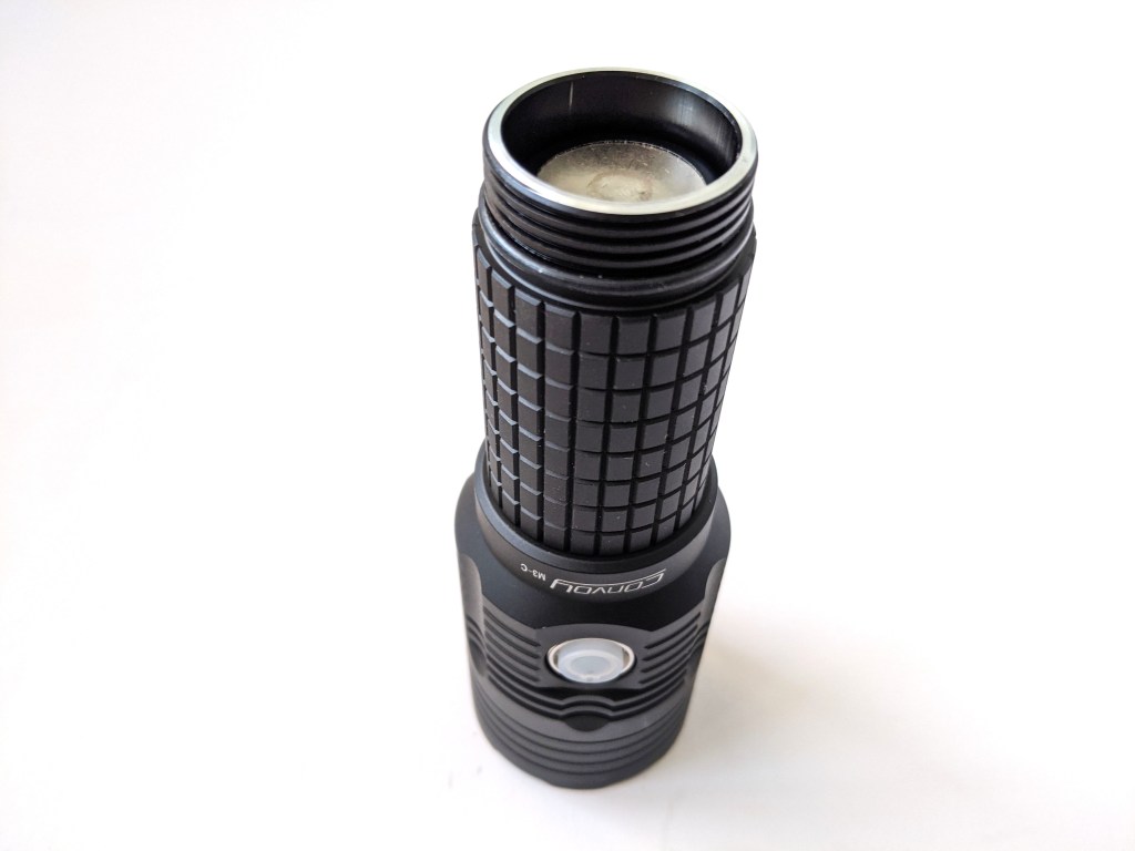 The light is sized for 26650 cells. I had a 5000mAh LiitoKala on hand but the best option right now is probably the 15A 5500mAh Keepower cell. The cell I had is 26.1mm in diameter and rattles a little in the 27.22mm inner diameter of the M3-C. This can be fixed with a bit of plastic. Convoy also includes 2 rubber rings that fit around an 18650 cell perfectly, making them fit perfectly in the M3-C. Convoy doesn’t mention 21700 cells on the product listing but they fit fine in the light with a bit of plastic as a homemade spacer.
