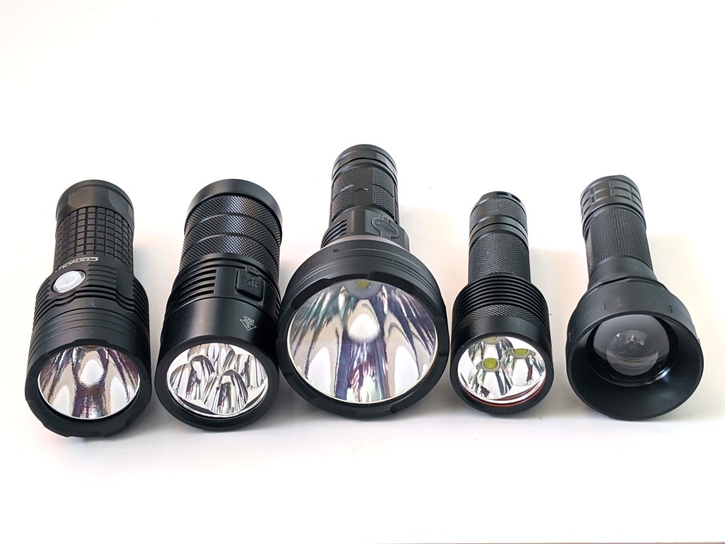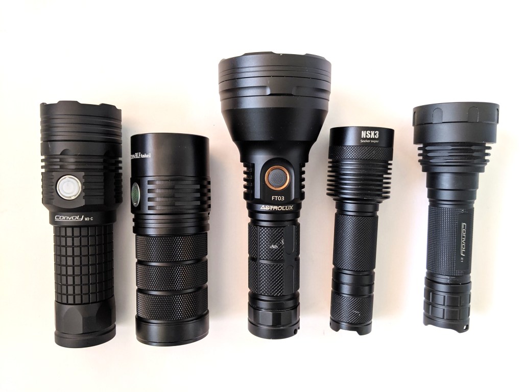 From left to right: Convoy M3-C (26650), Sofirn SP36 (3*18650), Astrolux FT03 (26650), Nightwatch NSX3 (21700), Convoy Z1 (21700).