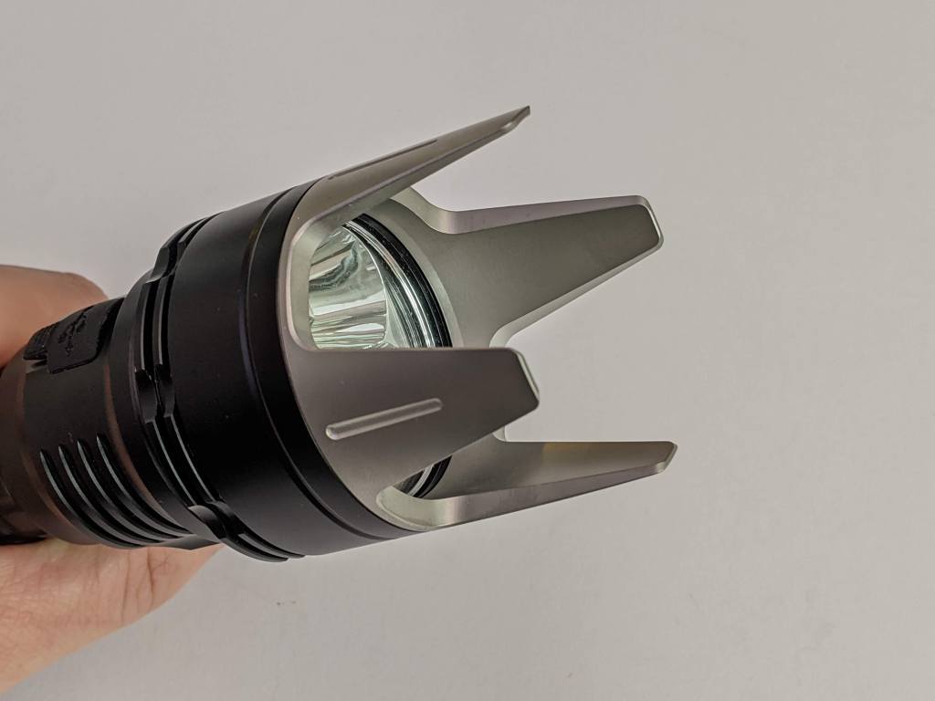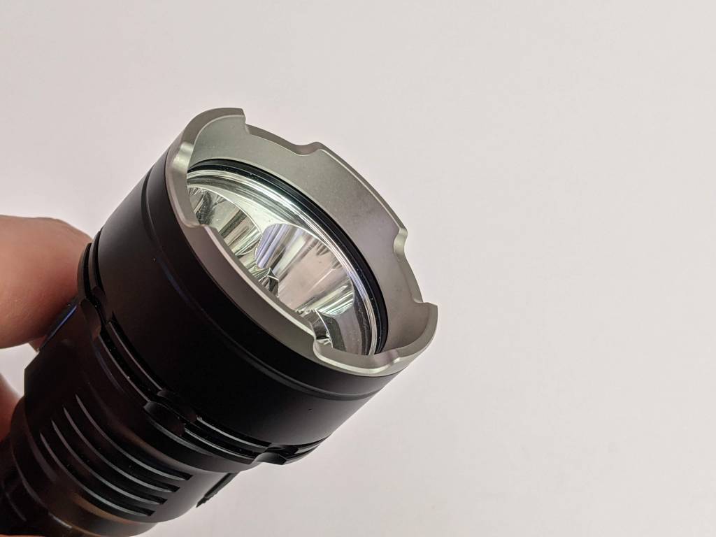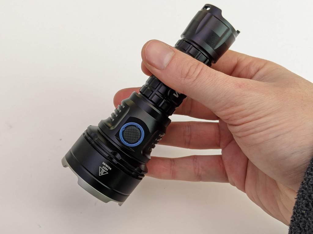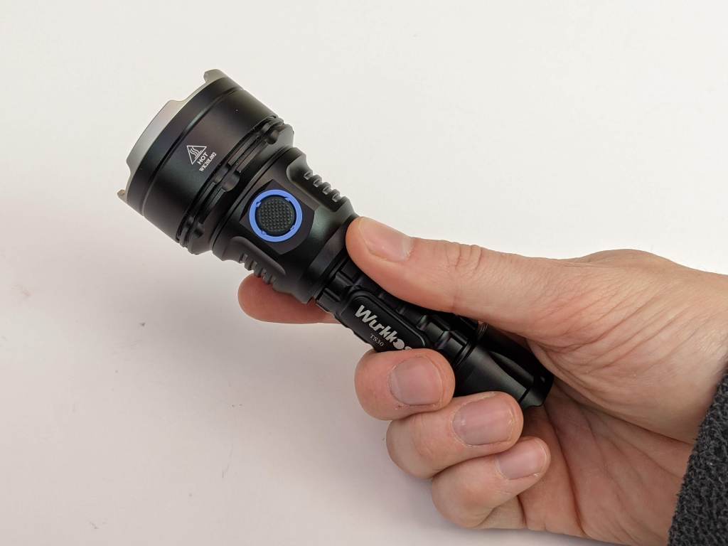 The Wurkkos TS30 is surprisingly small for a 5000lm flashlight. It has bumps, instead of knurling to give it good grip. The bit of the head with the switch is slightly raised, so it’s very easy to find the switch in the dark.