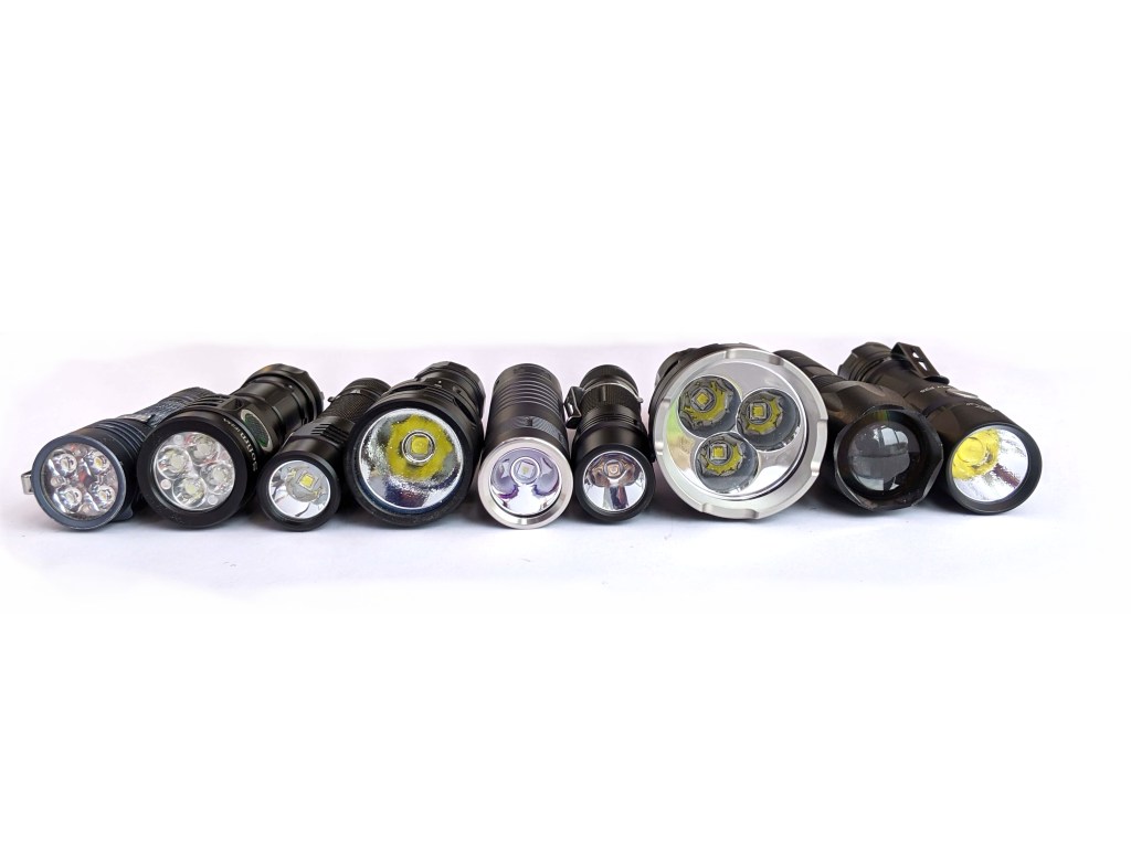 From left to right: Emisar D4V2 (18650), Sofirn IF25A (21700), Sofirn SC31 Pro (18650), Sofirn SD05 (21700), Convoy S21B (21700), Sofirn SP31 (18650), Wurkkos TS30 (21700), Generic zoomie (3*AAA), Cyansky P25 (21700).