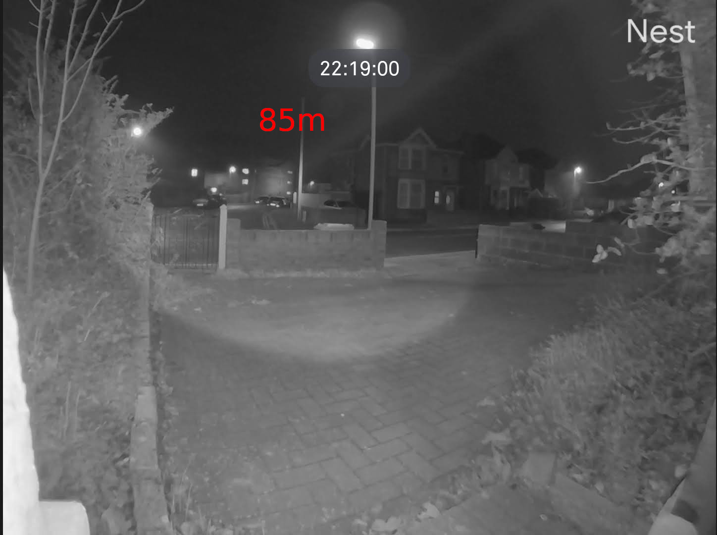 You can see here that the flashlight lights up the building at 85m away easily. With a proper night vision camera camera (especially with magnification) I’d expect the Cyansky K3-I8 to light up targets well over 100m and likely further.