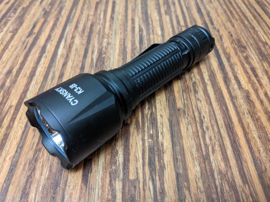 This is something a bit different: an infrared (IR) flashlight from Cyansky. The K3-I8 is very similar to their K3 tactical light but with a high power IR emitter instead of a normal white LED. Note that the model name is with the letter I, not number 1: K3-I8, not K3-18.