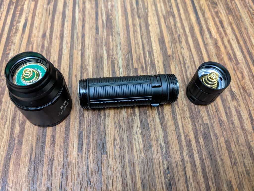 Opening it up you’ll see Cyansky’s usual high build quality. The threads are well lubed and square cut. The threads on the body tube are actually anodised at both ends, allowing the tube to be revered, which means the clip can go either way round.